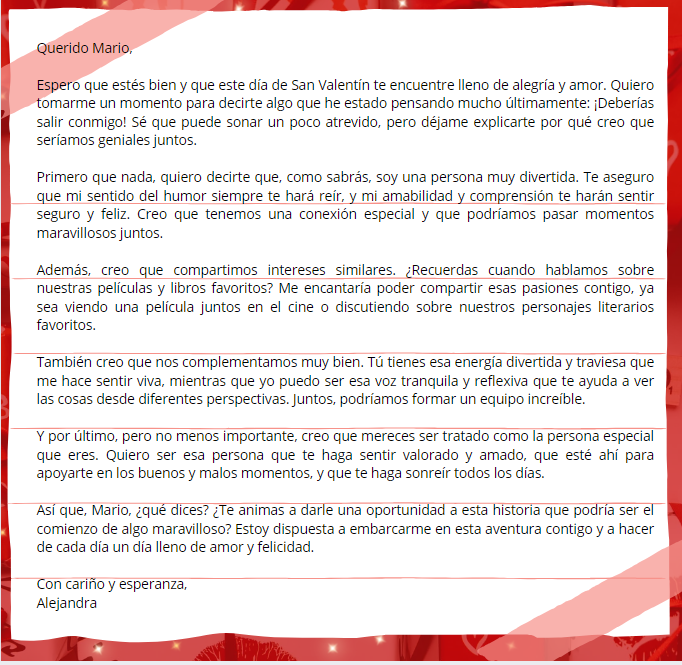 ¡El amor está en el aire! No siempre es fácil gustarle a las personas, por eso te invitamos a escribir una carta de amor en la que puedas explicar buenas razones por las que salir contigo. Podéis ser todo lo originales que queráis y escribir en parejas, ¡pero sed sinceros! Cupido os estará vigilando.